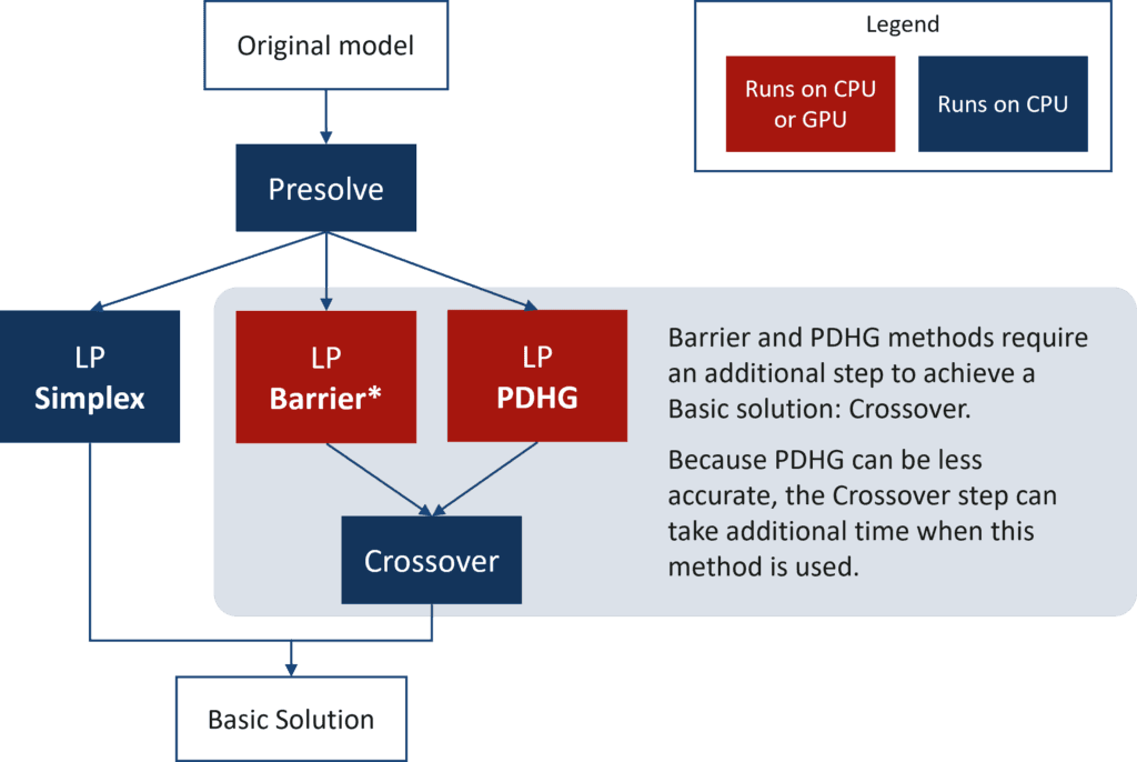 First-order methods like PDHG and components of the barrier method can both run on a GPU; however, PDHG has received significant attention in recent years. This is because the mechanics of the PDHG algorithm are much simpler to implement on GPUs. If you’re wondering why the primal and dual simplex methods are not part of this discussion, it is because these algorithms are already difficult to parallelize on CPU hardware, and even more so on GPUs.