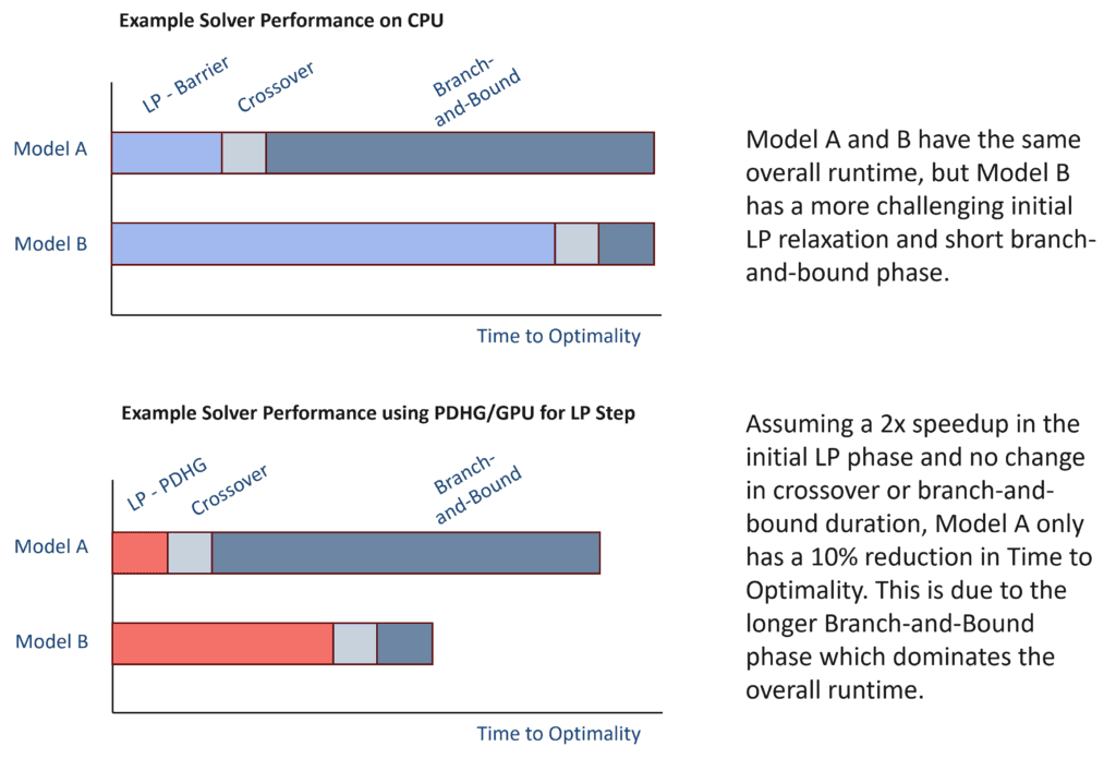 Regarding what is possible today for MIPs, cases where the majority of solve time is spent in the initial LP root relaxation may benefit from using GPUs for that step in the Branch-and-Bound framework (e.g., the rmine25 model in Example 2 here). Figure 3 illustrates this concept, where you can see that Model B experiences a larger improvement in Time to Optimality than Model A, because the LP phase takes up a larger portion of the overall runtime. If you are working with a model that seems to have similar behavior to Model B, it is certainly worth evaluating whether using PDHG on GPU for the initial LP step improves overall performance.