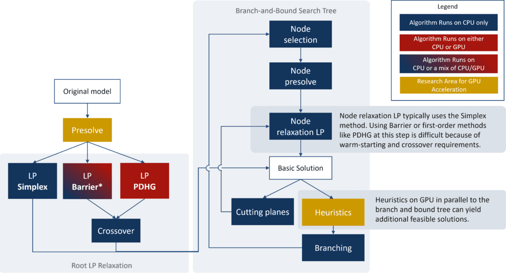 LP solves form the backbone of today’s MIP algorithms. The simplified framework in Figure 2 illustrates the Branch-and-Bound search used when solving a MIP. There are multiple areas where GPUs can aid in the workflow: