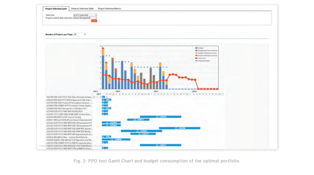 The key decision variables of the PPO model were the selection of IT projects to be included in the portfolio and the start times of the selected projects. The input data for the PPO model came from the BVP and PPM tools. The PPO model could handle a single business objective maximization problem or it could handle a problem with multiple business objectives using the lexicographical (hierarchical) method. The key output of the PPO tool is shown in Figure 2.