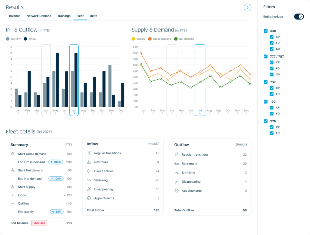 “What kinds of pilots, and how many, do you need to fulfill a given network demand and support a given company strategy? And at what moment in time? These are the things airlines have to consider,” explains Irina Komissarova, KLM’s Product Lead for the partnership with BCG “For instance, imagine an airline is looking to change the aircraft type for a specific fleet. This will of course have repercussions on the pilot population somewhere else.”