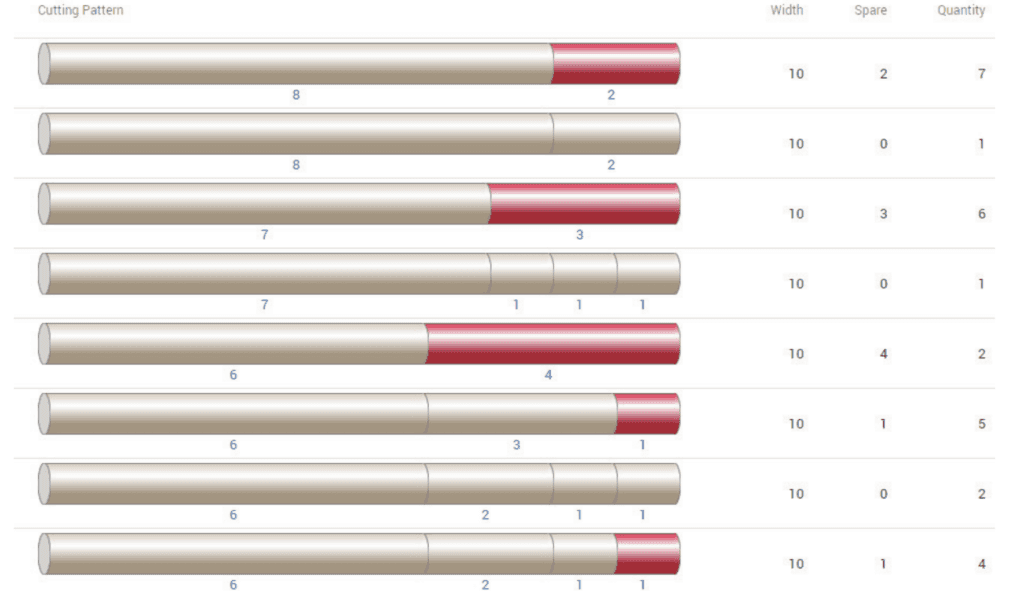 The machine has a specific number of usable knives to cut the master roll. The number of knives in the machine limits the possible cutting configurations. After a master roll is cut, the left-over (spare) roll may be re-usable if the spare roll width is larger than a specified threshold width.