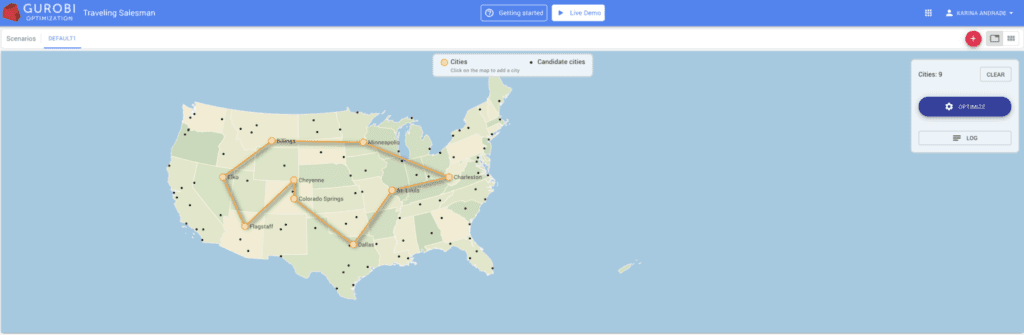 To access the Traveling Salesman Problem demo application and create your scenario using your own data from a blank template or to play with existing default scenarios, you must first register for a Gurobi website account and then view the demo.